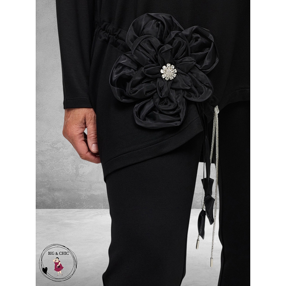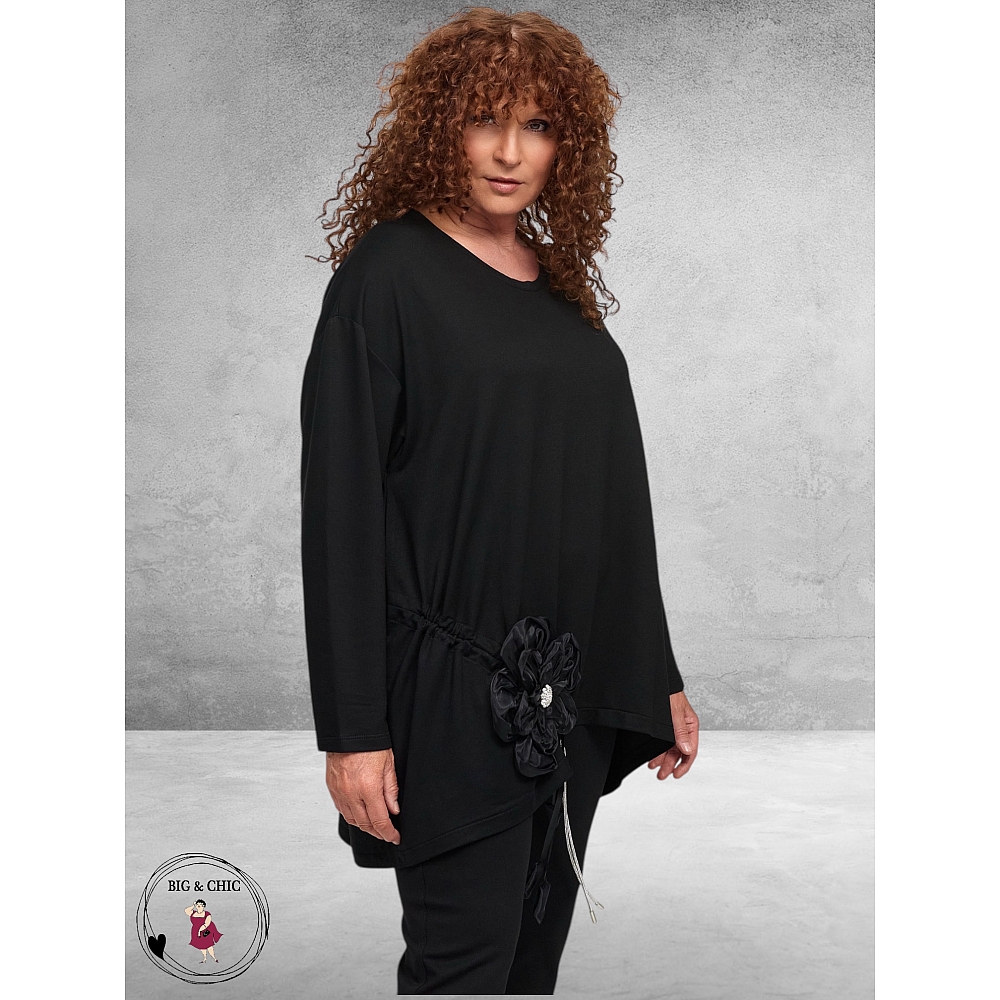 Frenzi shirt – Zwart met opgestikte bloemapplicatie en asymmetrische zoom