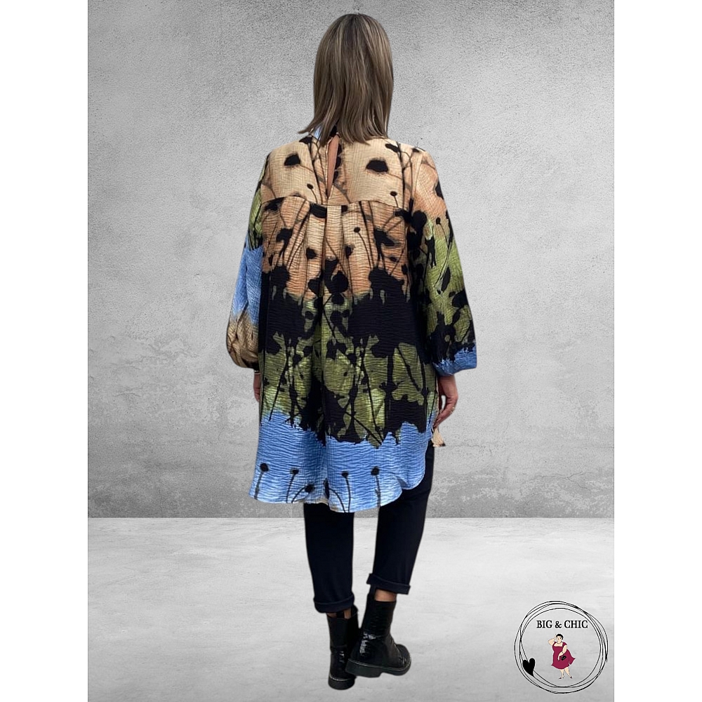 Noen Tuniek/Blouse – Blauw met Beige, Zwart & Groen Print