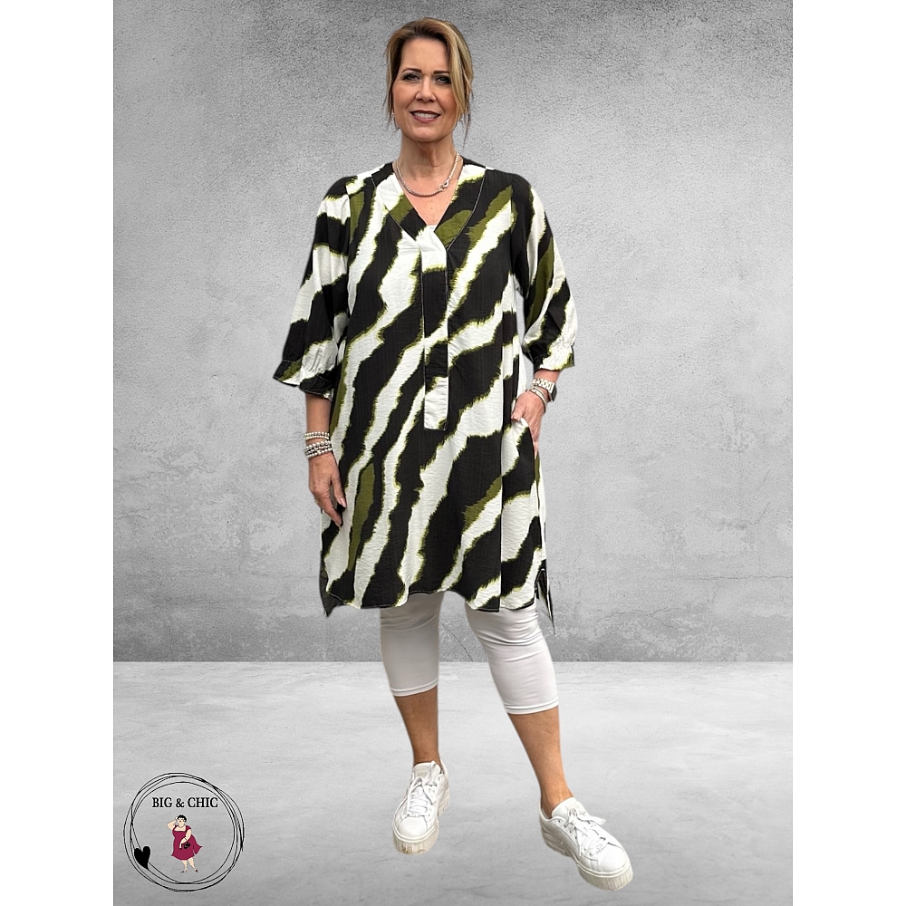 De tuniek heeft een print van zwart met groen op witte ondergrond, waardoor het geheel een zachte, elegante look krijgt.