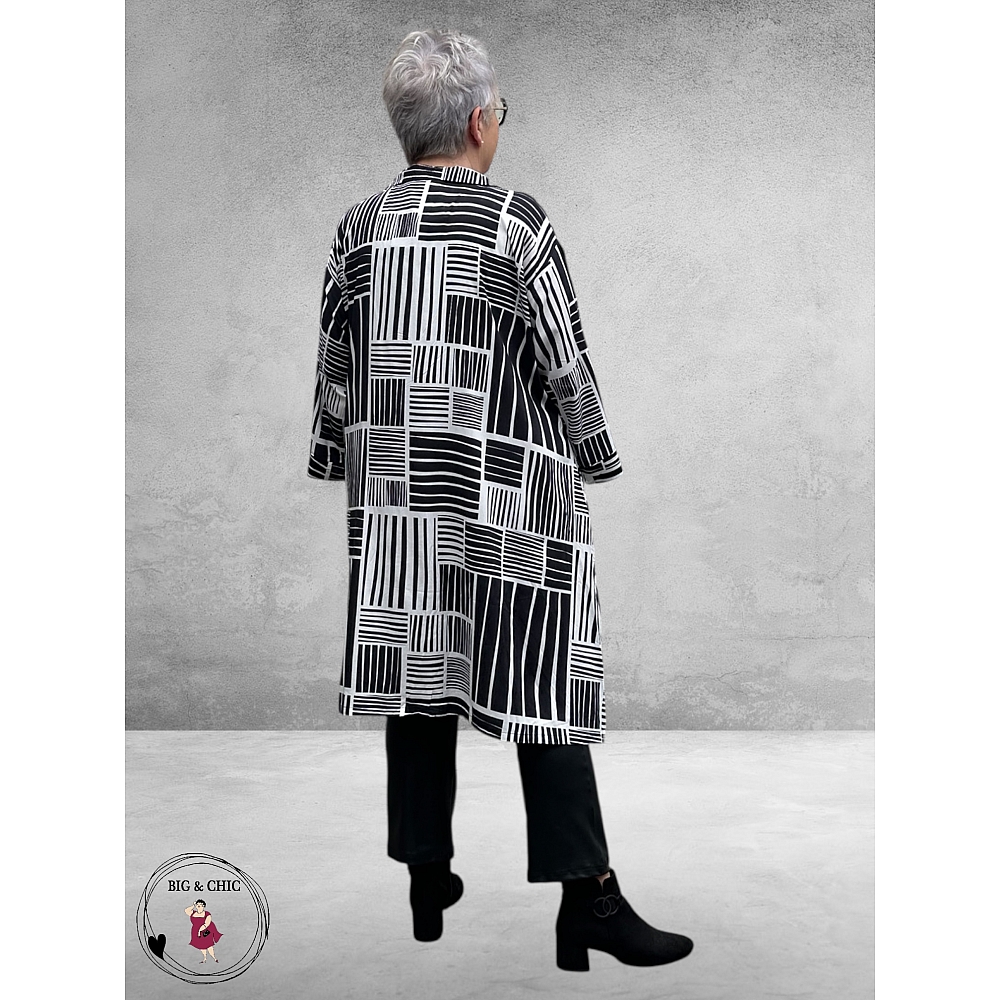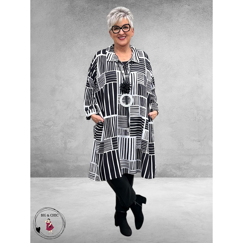 De zwart-witte print geeft het item een moderne en artistieke uitstraling, terwijl de luchtige pasvorm en vrouwelijke A-lijn zorgen voor een elegant silhouet.