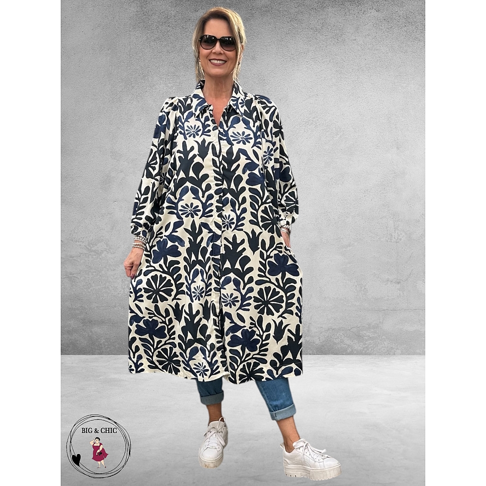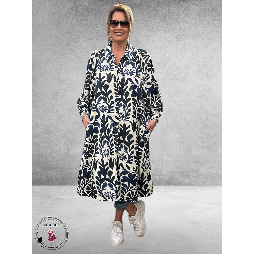 De klassieke kraag en knoopsluiting geven de jurk een elegante uitstraling, terwijl de speelse print zorgt voor een frisse, moderne look.