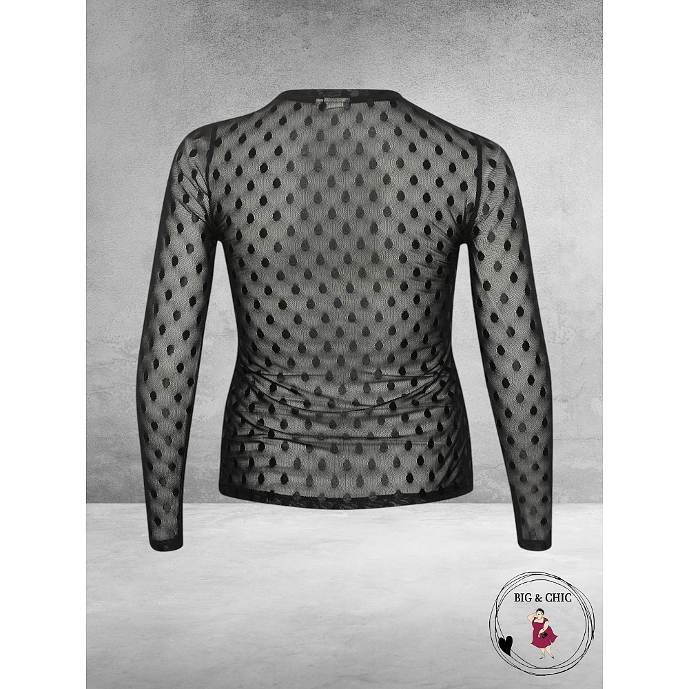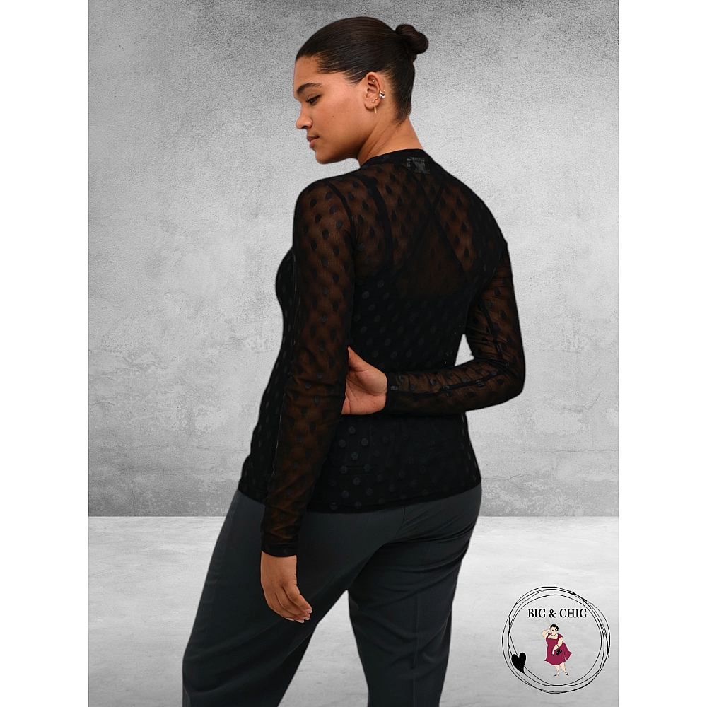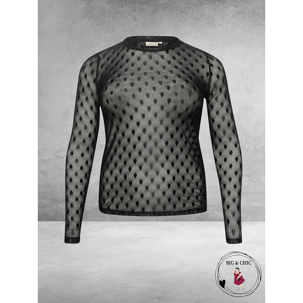 ** NIEUWE COLLECTIE **Leuk transparant mesh look truitje van KAFFE CURVE in het zwart met bolletjes print.Ideaal om onder een blazer, tuniek ,vest of jasje te dragen, of gewoon zo met een top eronder....
