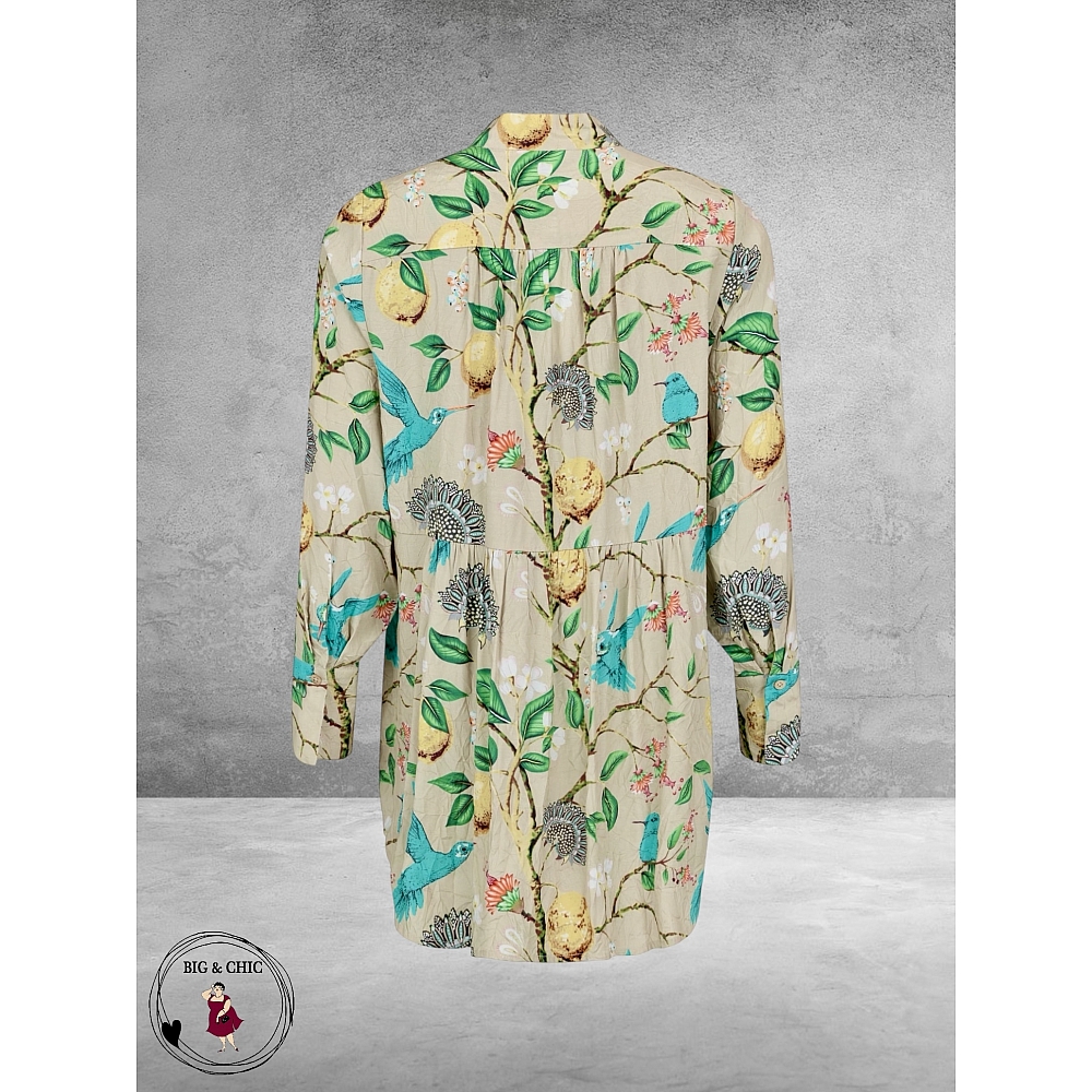 De zachte beige ondergrond met kleurrijke vogels, citroenen, bloemen en bladeren geeft de blouse een frisse en bijzondere uitstraling.
