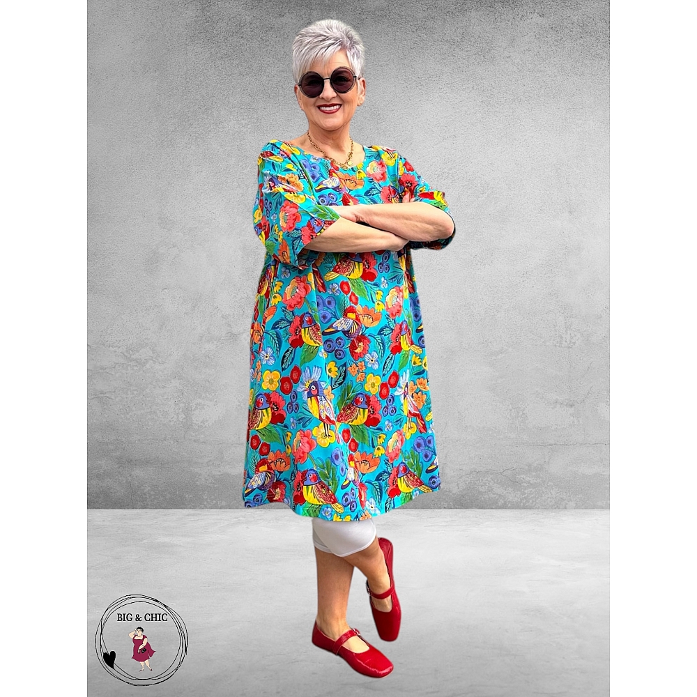De prachtige multi-print met vogels komt schitterend tot zijn recht op de frisse aqua-groene ondergrond en geeft de jurk een vrolijke, zomerse uitstraling.