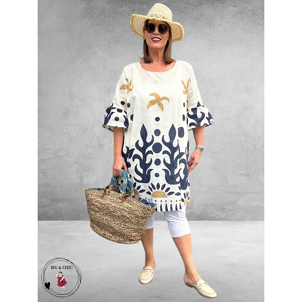 De prachtige blauwe en beige print komt schitterend tot zijn recht op de frisse creme ondergrond en geeft de jurk een vrolijke, zomerse uitstraling.