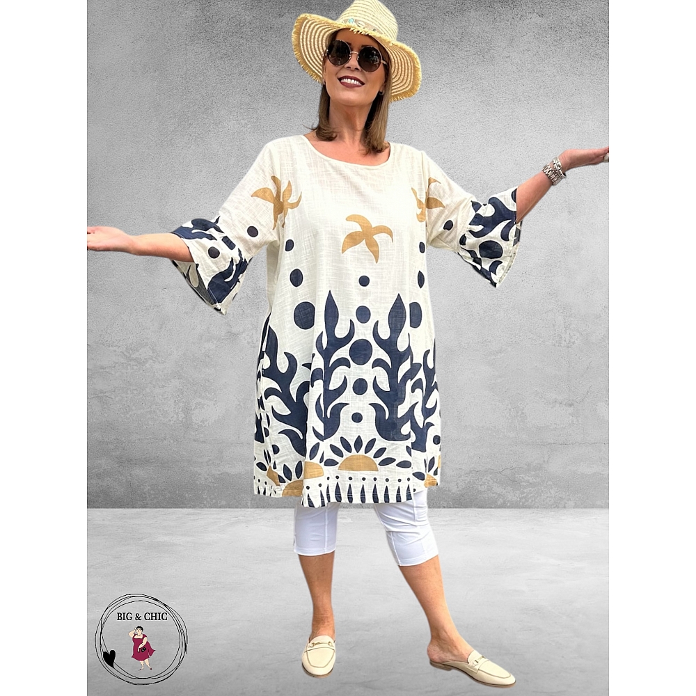 • Kleur: multi print blauw en beige op creme