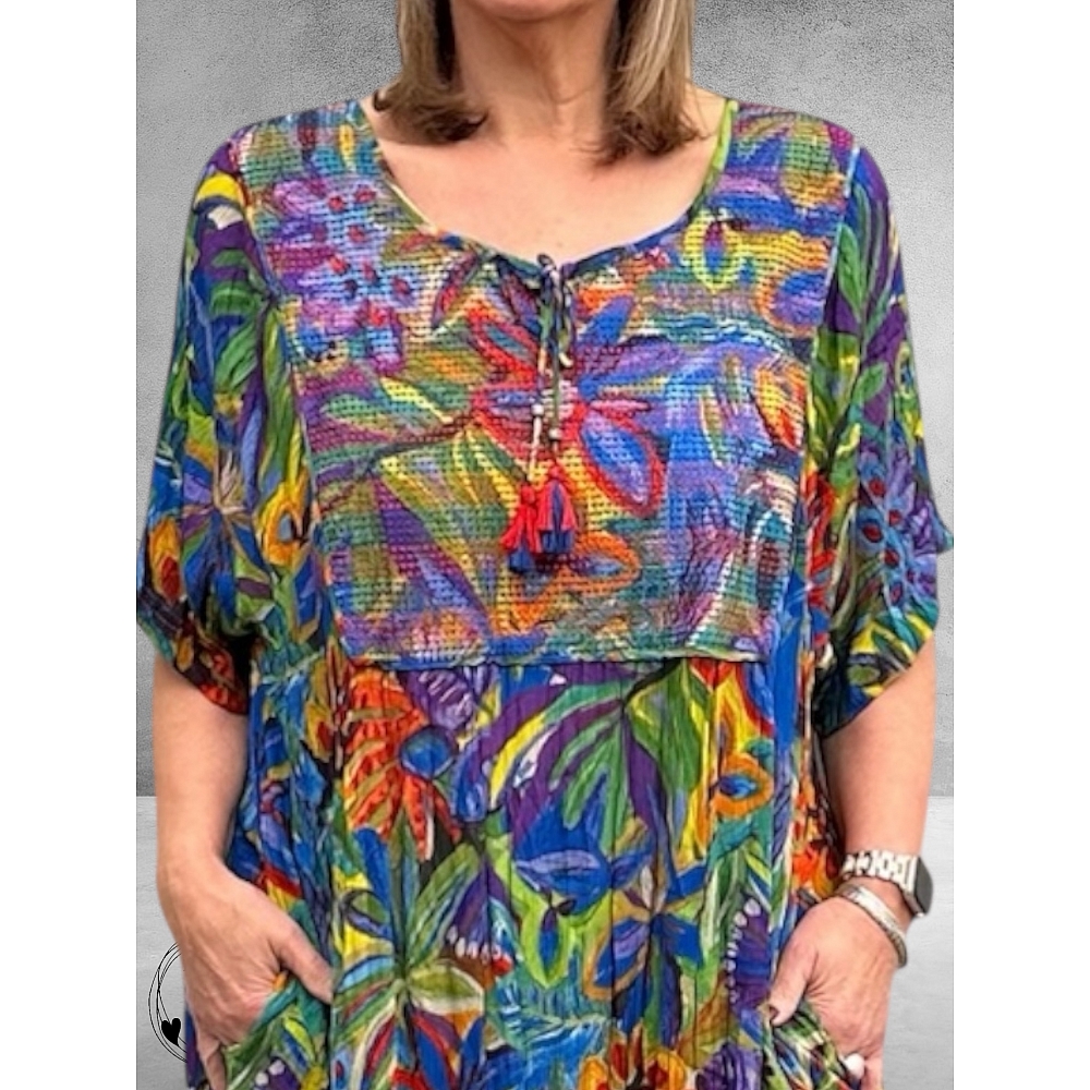 De print combineert verschillende levendige kleuren zoals groen, blauw, rood, oranje, geel en paars — een echte zomerse blikvanger.