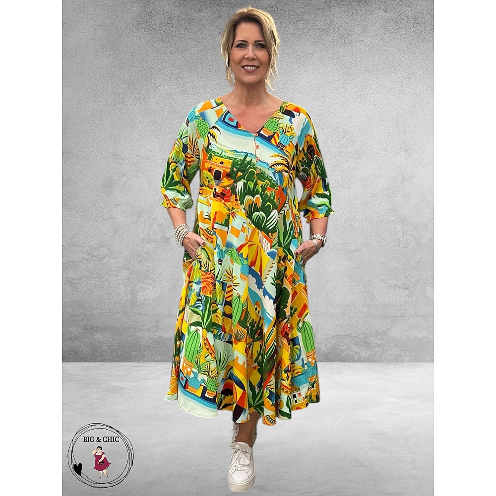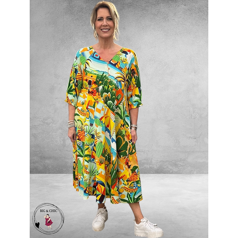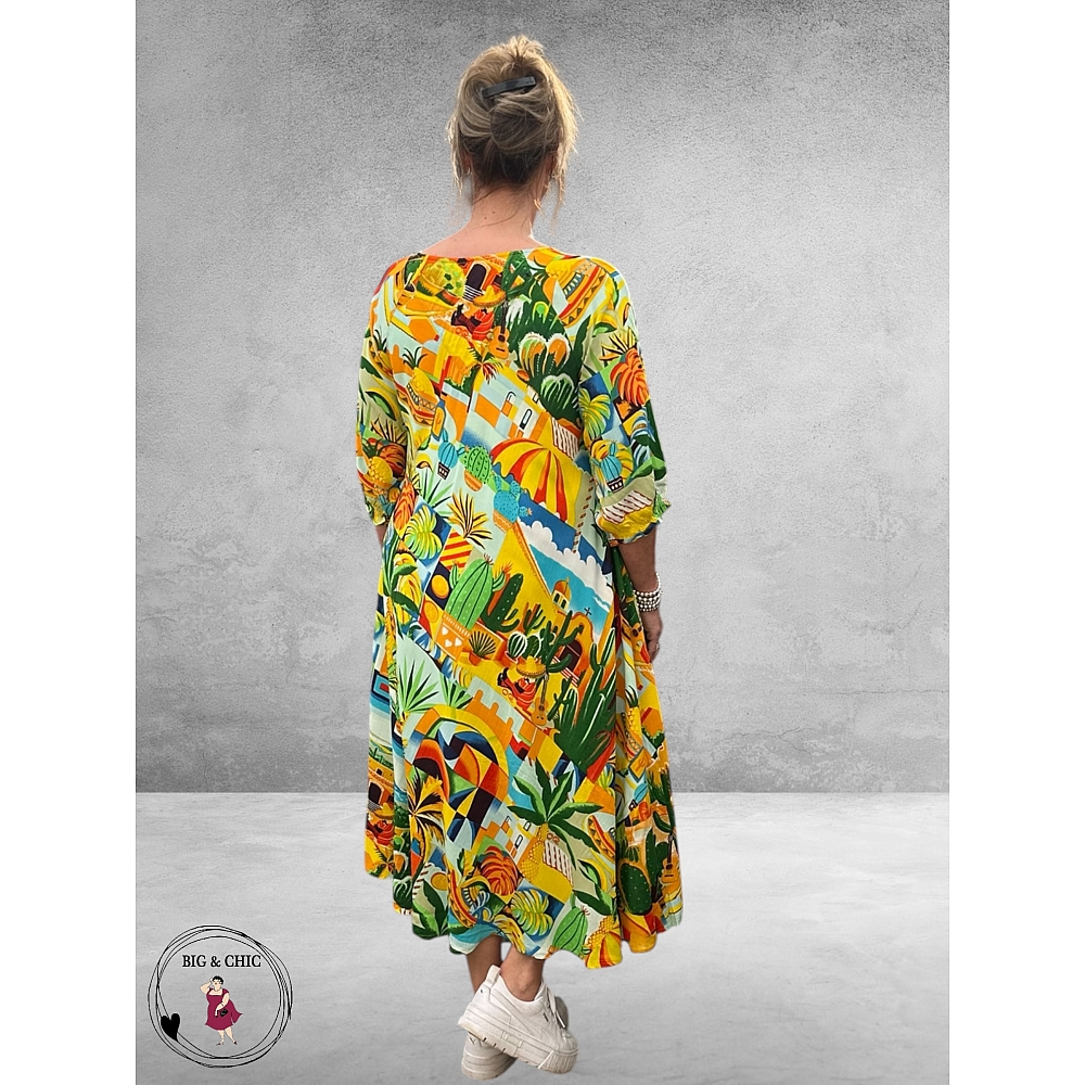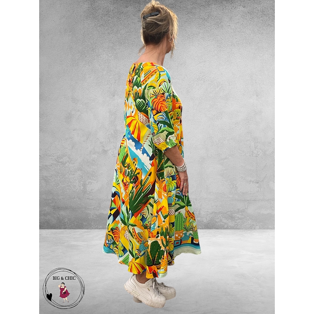 De levendige print vol tropische kleuren en speelse illustraties geeft deze jurk een unieke, artistieke uitstraling.