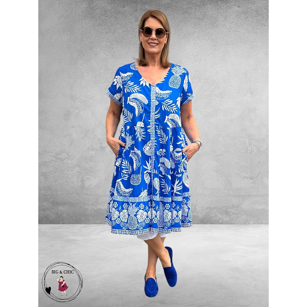 Deze vrolijke en comfortabele jurk van Orientique in de print Comondoro Blue is een echte zomerse blikvanger. De frisse blauwe kleur met witte tropische print geeft de jurk een speelse en stijlvolle uitstraling.
