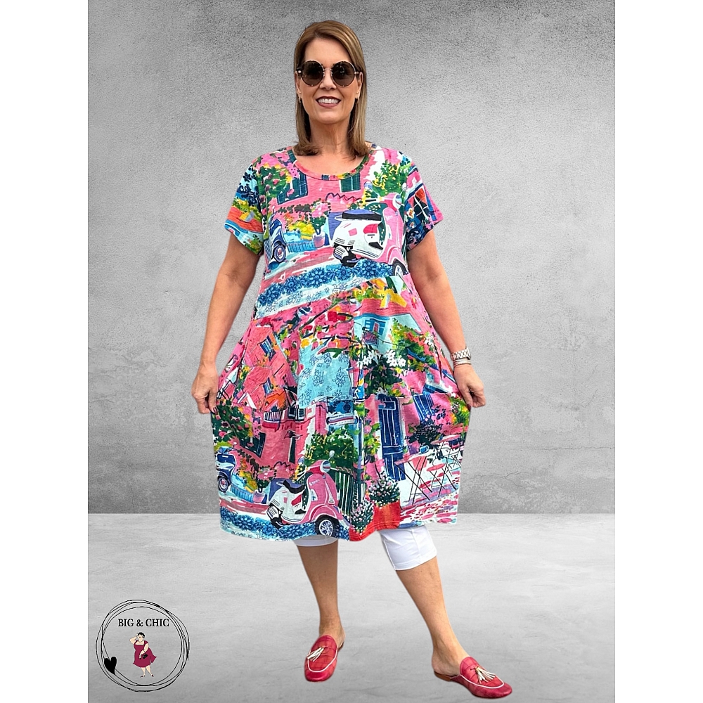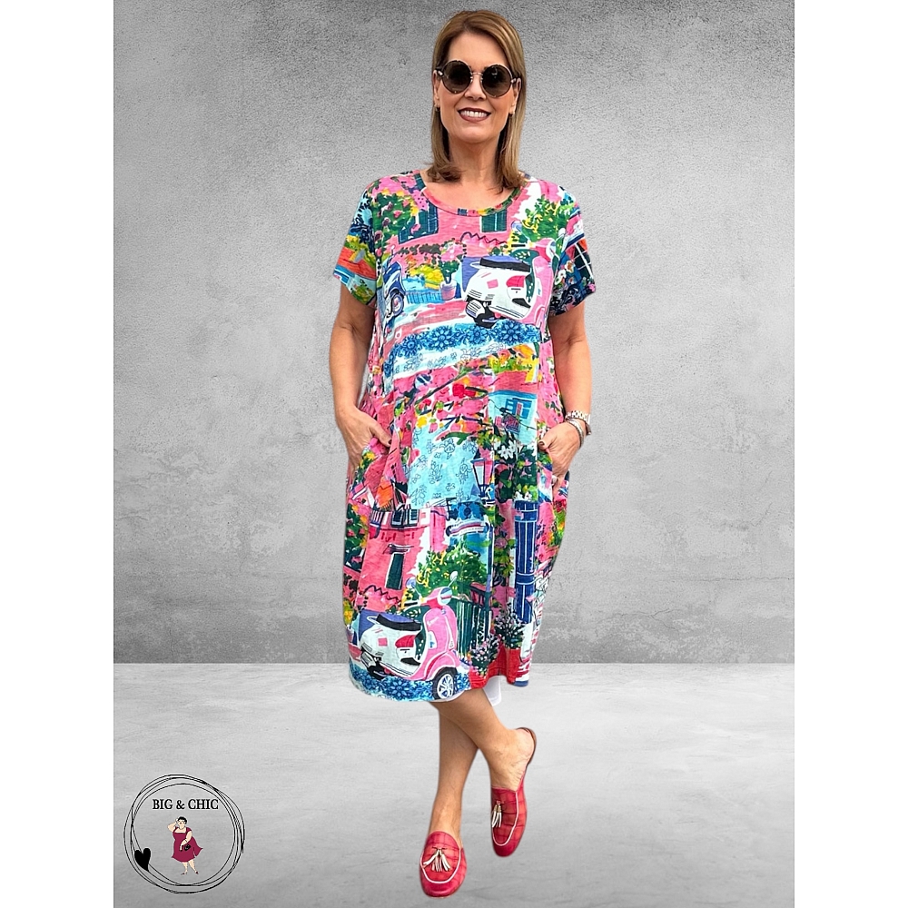 De vrolijke Scooter-print geeft de jurk een speelse en zomerse uitstraling. De kleurenmix van roze, pink, fuchsia, blauw en aqua zorgt voor een frisse en levendige look die perfect past bij zonnige dagen.