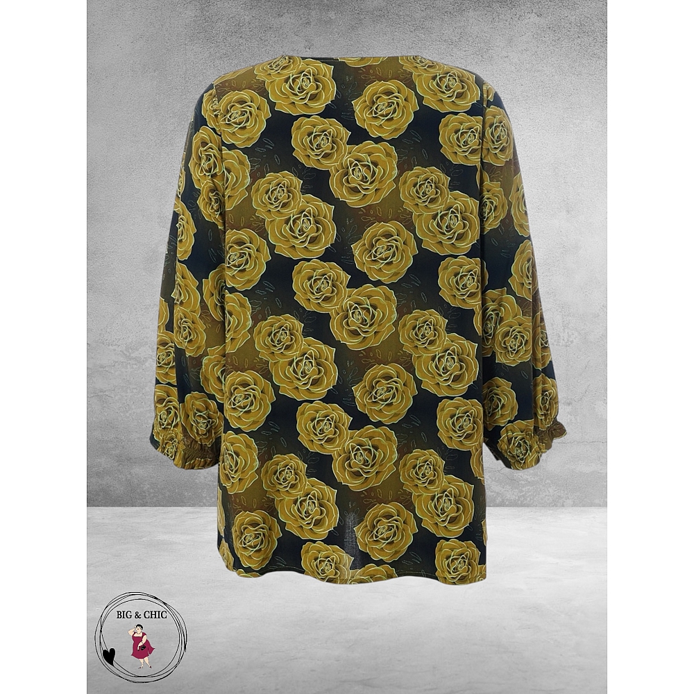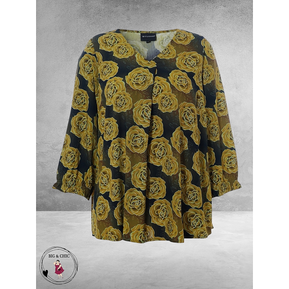 Uniek, speels en comfortabel is deze blouse van STUDIO met een groene en kerrie kleurige rozen print is een echte blikvanger dit najaar.