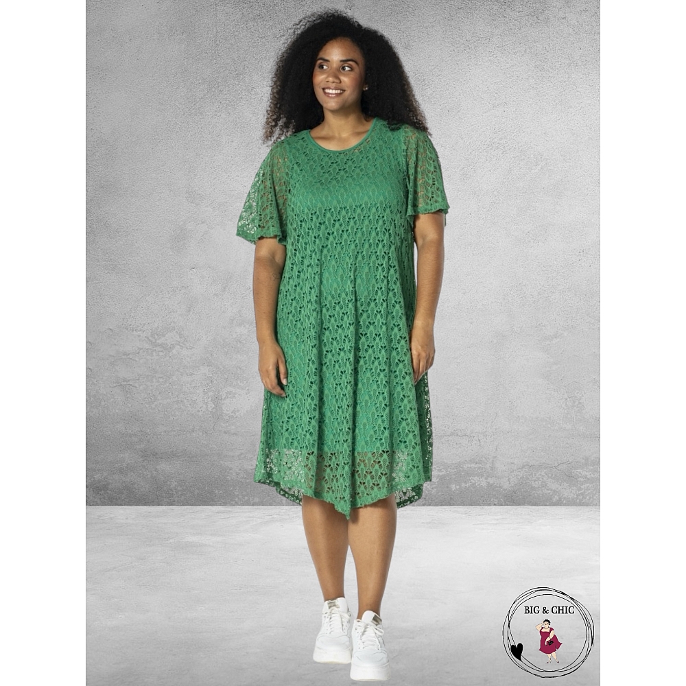 Deze beauty van modemerk STUDIO bestaat uit delen; een eenvoudige onderjurk en een kanten bovenjurk in frisgroen.