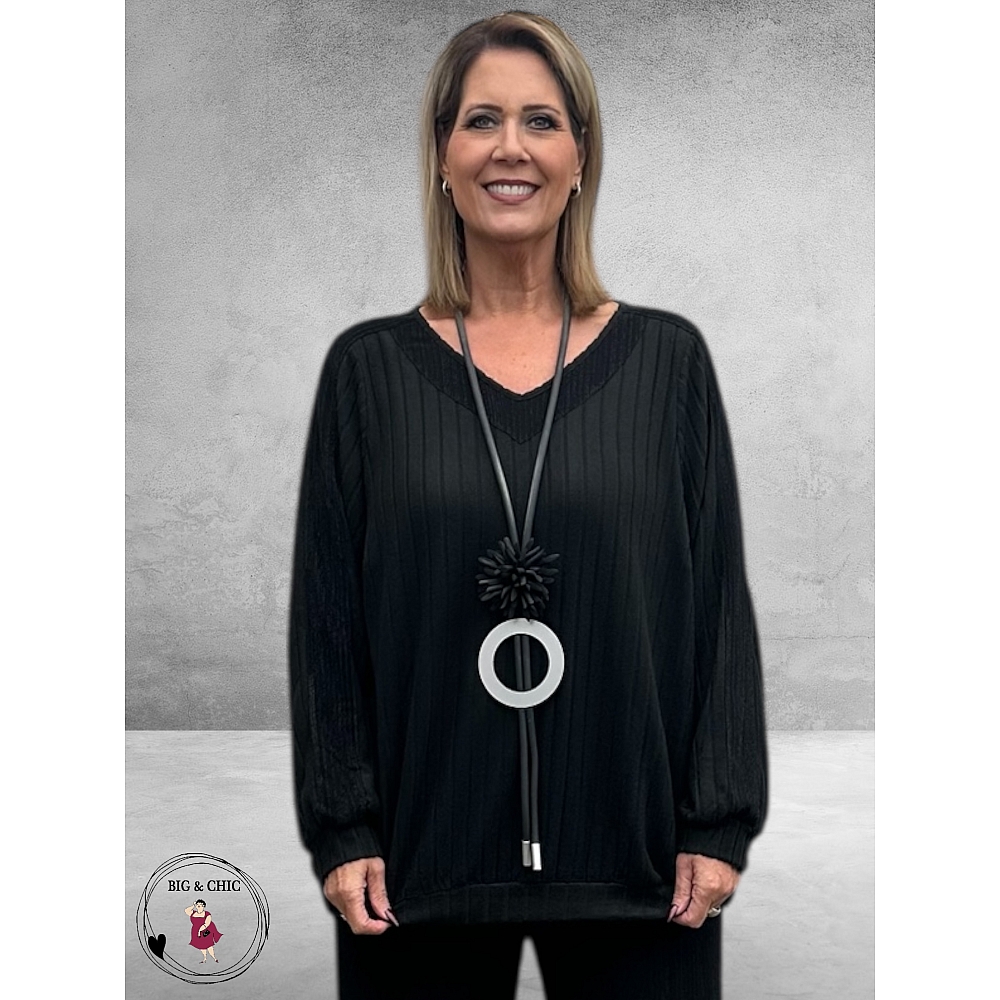 De ronde hals die subtiel uitloopt in een V wordt omlijst door een glinsterende sierband die vanaf de hals doorloopt langs de mouwen tot helemaal beneden – een elegante eyecatcher die elke look net dat beetje extra geeft.