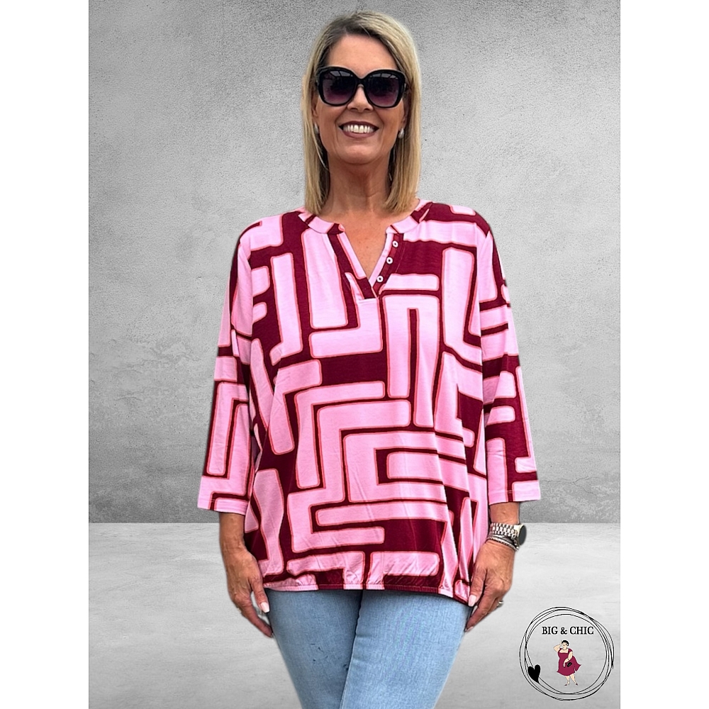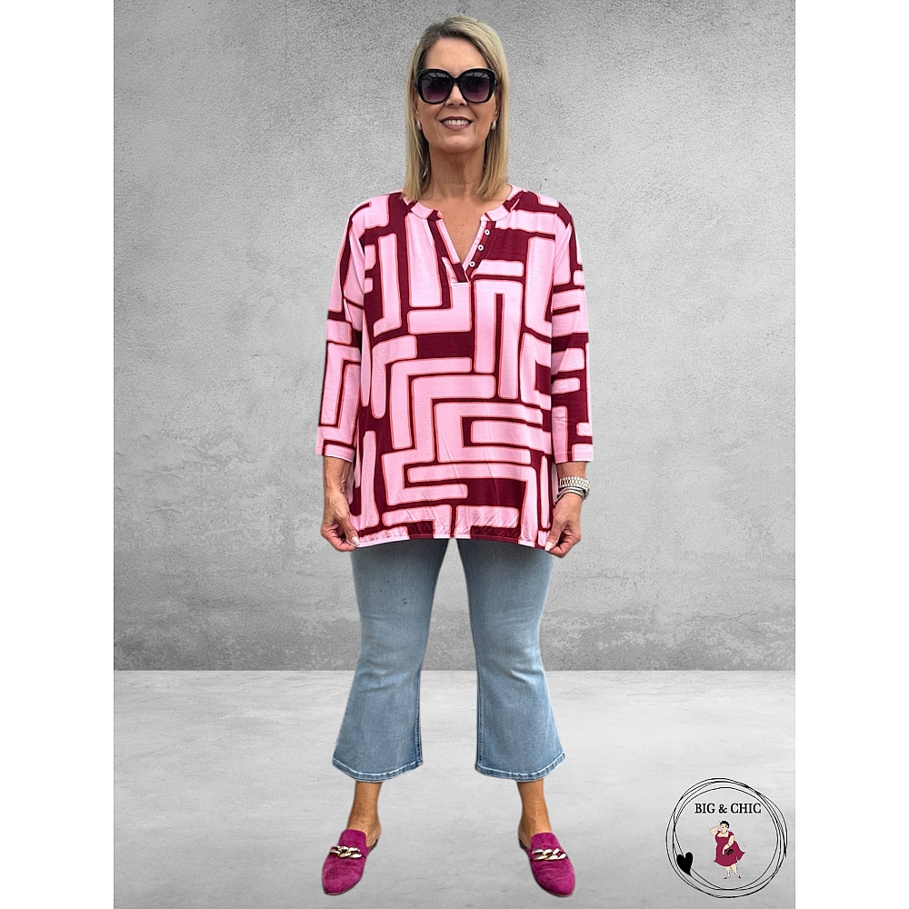Fris vrouwelijk en comfortabel, dit stijlvolle shirt van VIA APPIA DUE uit de Berry Vision collectie heeft een diepe berry en roze kleur en een grafische print, een echte blikvanger met een zachte vrouwelijke uitstraling.