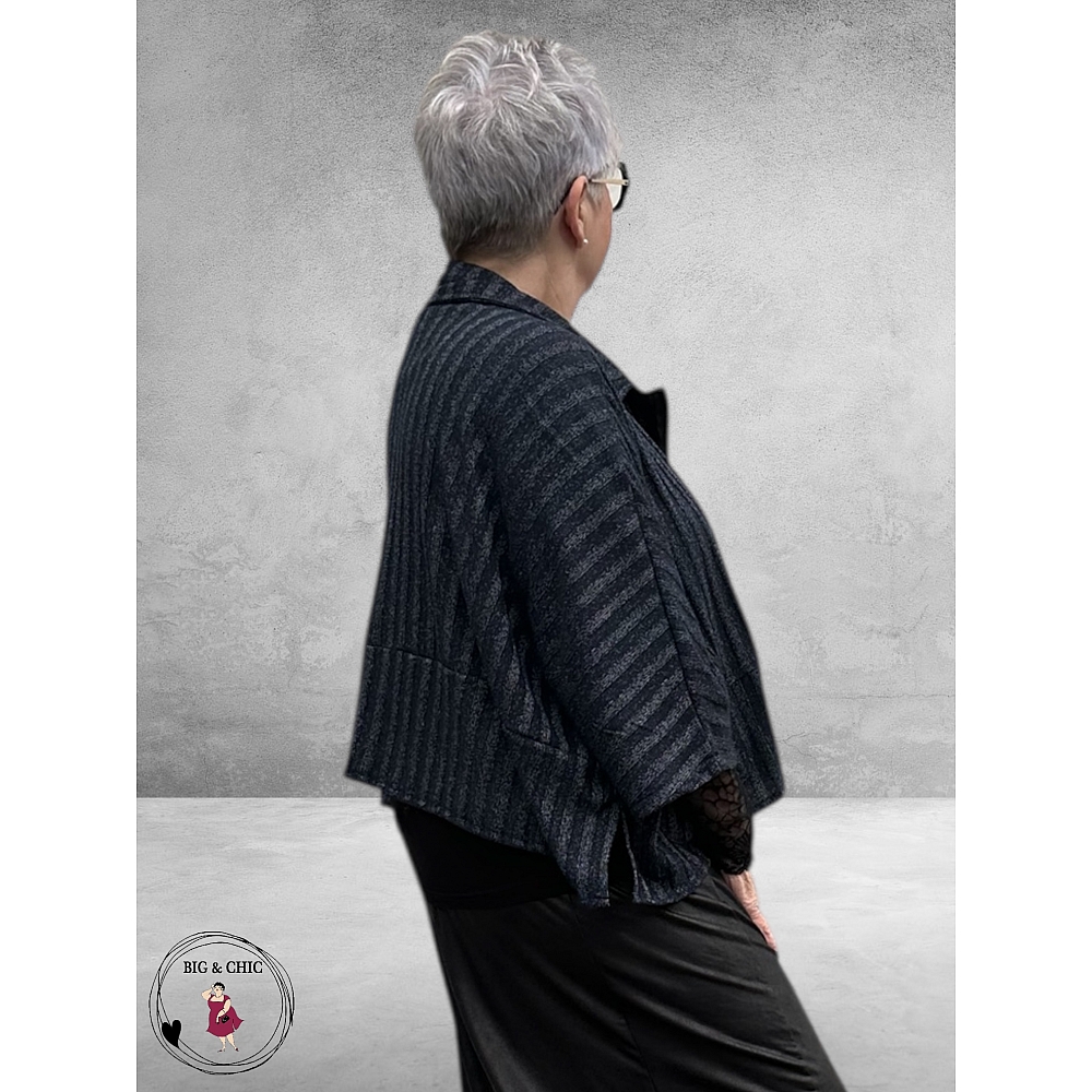 De kraag en de opgestikte zakken aan de voorzijde versterken het casual-chique karakter, terwijl de zijsplitten zorgen voor extra bewegingsvrijheid en een mooie valling.