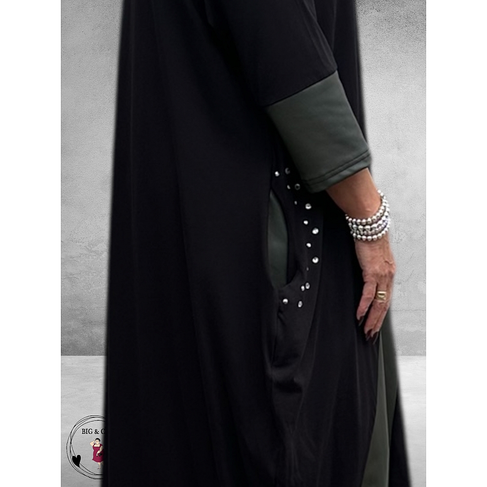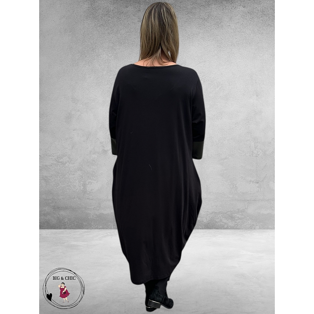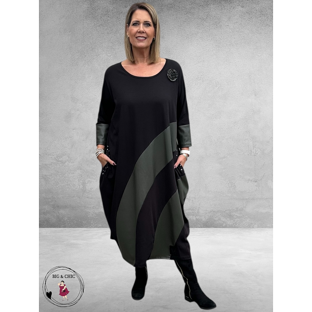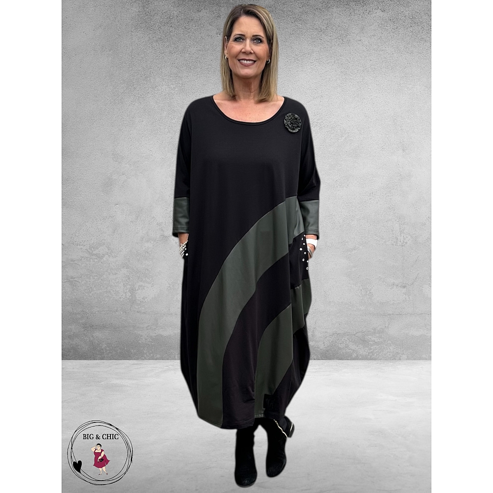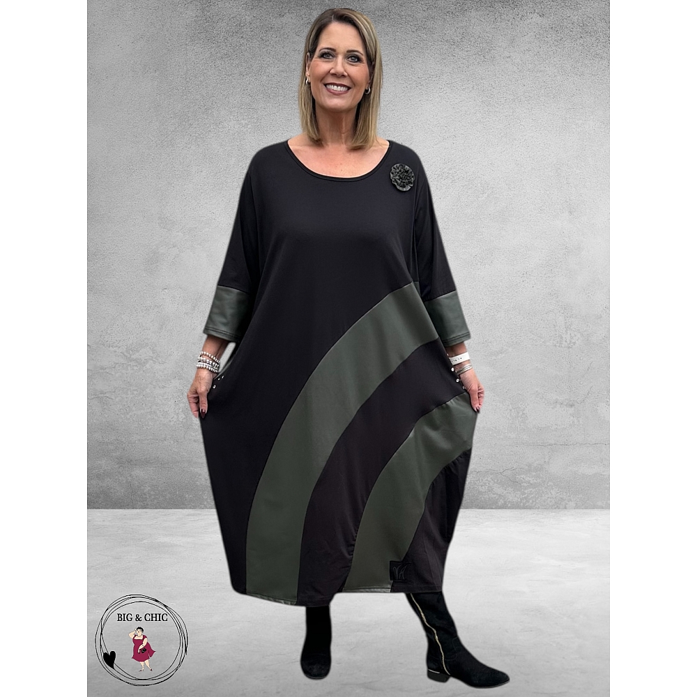 Aan de voorkant geven brede, schuine inzetten van leerlook in mudkleur de jurk een modern, verfijnd contrast.